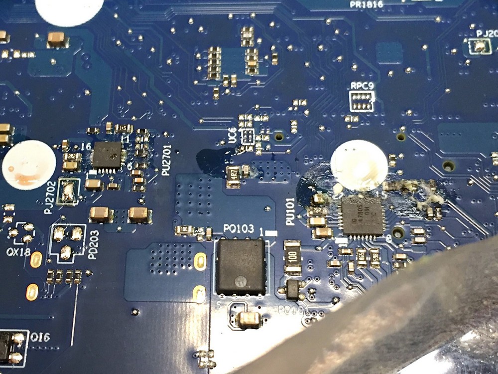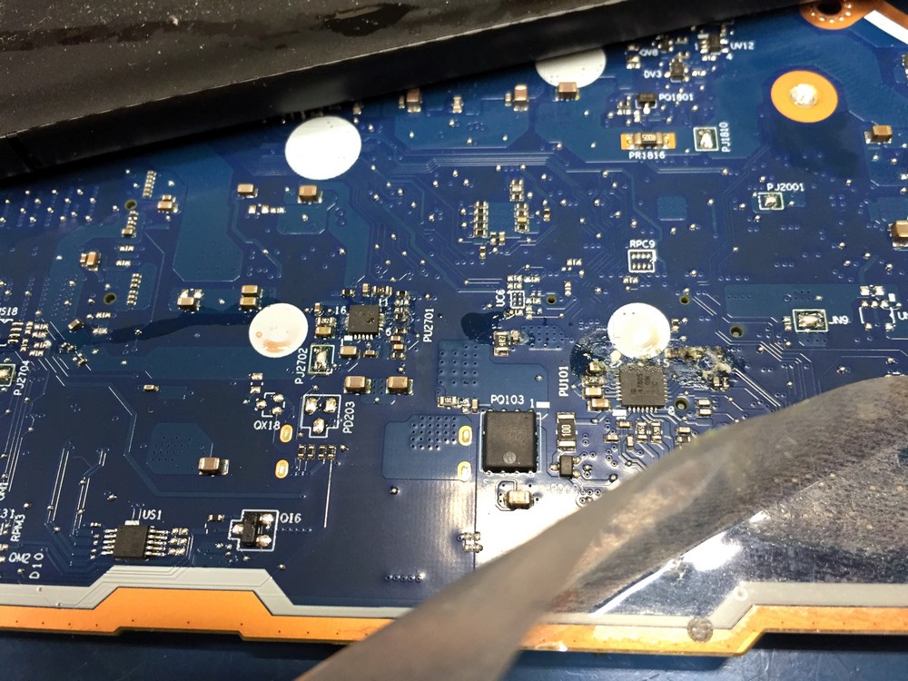 W przypadku tego laptopa bateria nie chciała się ładować, a na ekranie wyświetlany był symbol przekreślonej baterii. Niezbędna była wymiana baterii na nową ale również czyszczenie płyty głównej po ingerencji cieczy. Jak okazało się po diagnostyce przeprowadzonej przez naszego serwisanta to zalanie laptopa było przyczyną uszkodzenia baterii. Na płycie widoczne były zacieki i ślady zalania. Przy okazji wymieniliśmy również pastę termoprzewodzącą na procesorze.